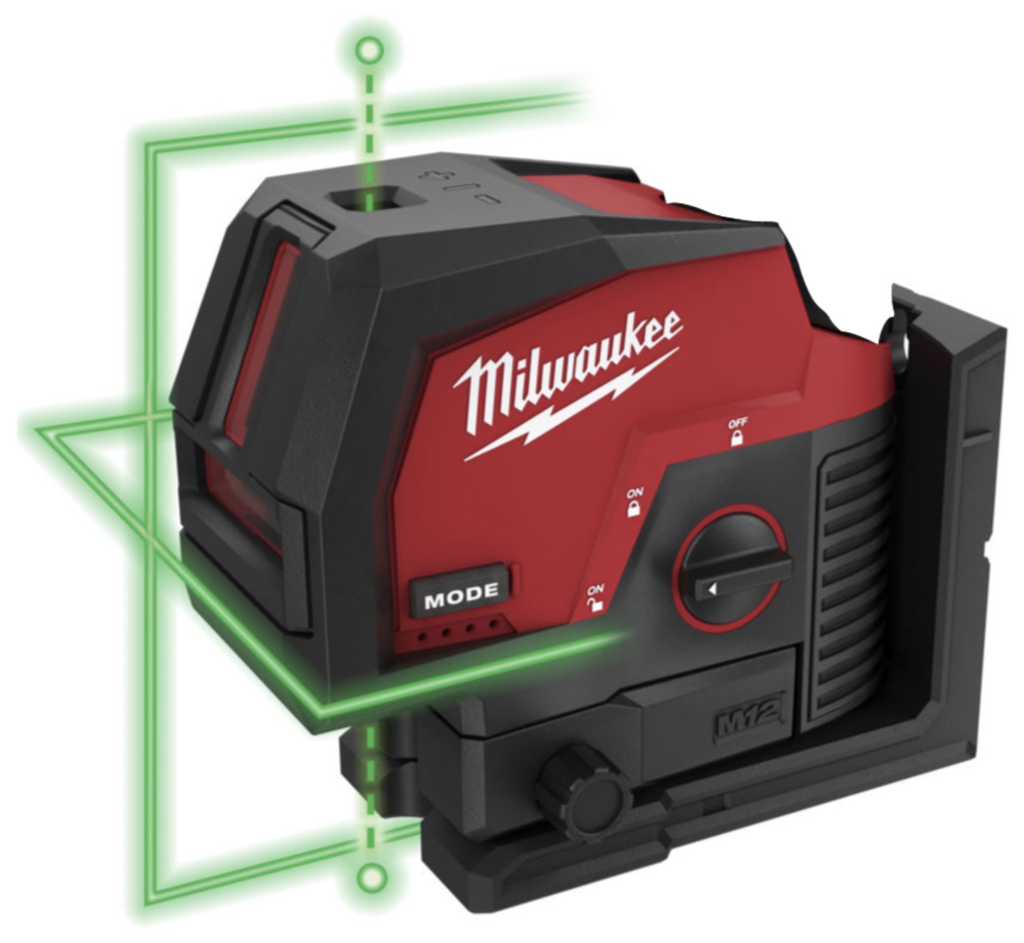 Aku křížový liniový laser M12 CLLP-0C Milwaukee se zelenými paprsky a s funkcí olovnice poskytuje funkčnost vše v jednom pomocí horizontálního srovnání, vertikálního srovnání a funkce olovnice pro přenos bodu z podlahy na strop.