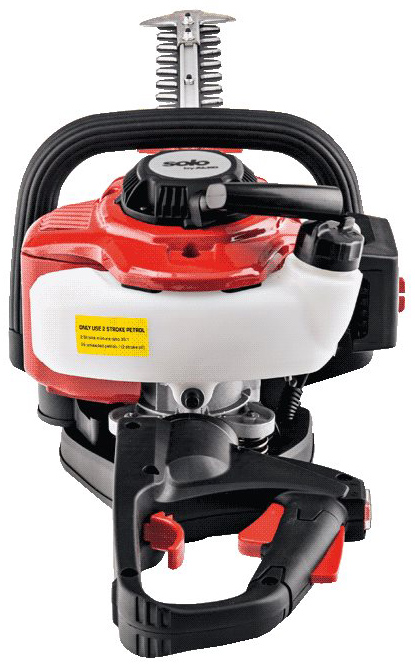 Benzínové nůžky na živý plot s ocelovou bezpečnostní čepelí s délkou 70 cm a objemem nádrže 440 ml.