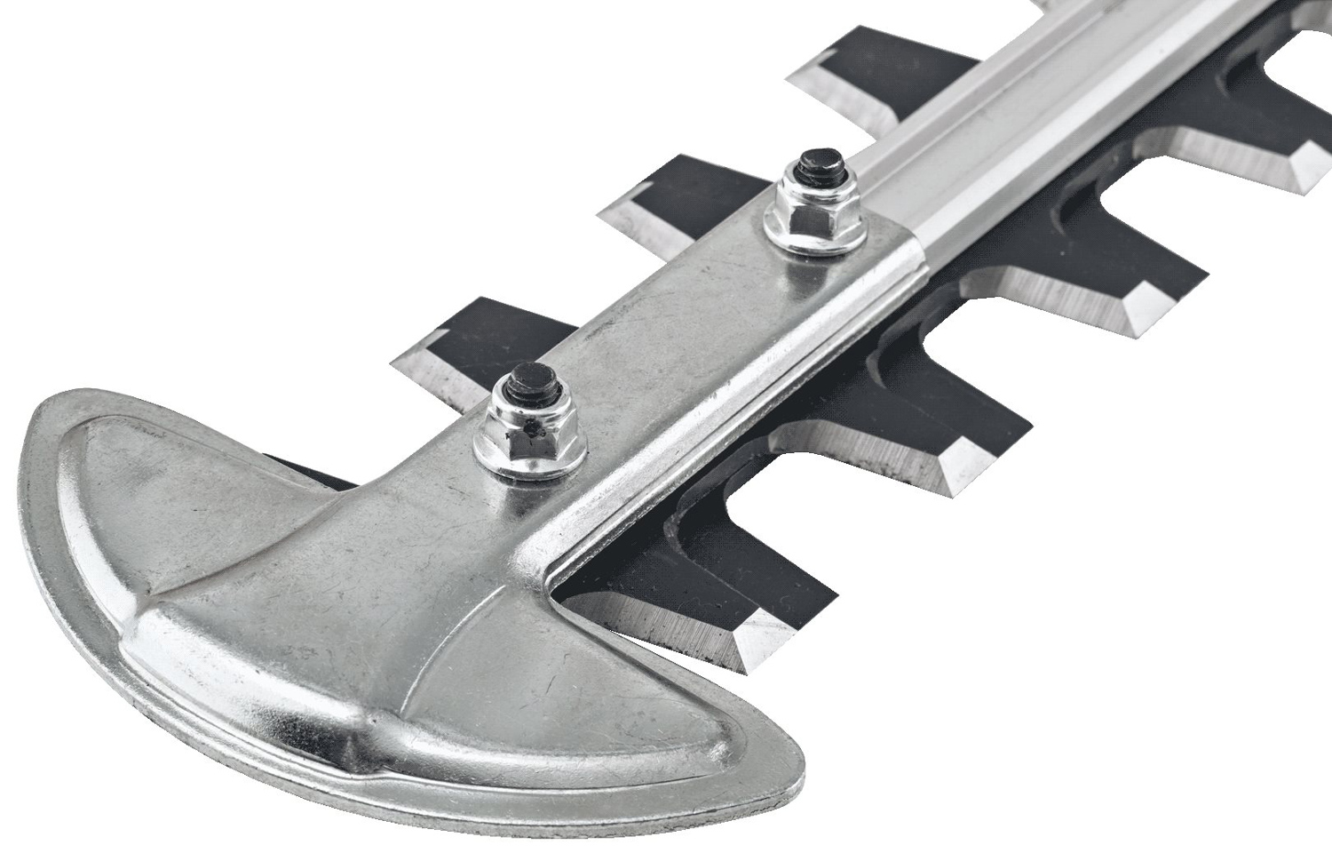 Benzínové nůžky na živý plot s ocelovou bezpečnostní čepelí s délkou 55 cm a objemem nádrže 440 ml.