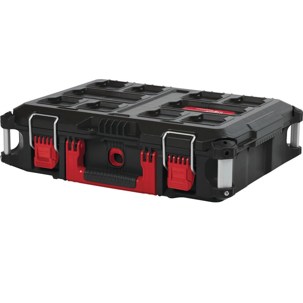 Box z řady PACKOUT Milwaukee pro organizaci nářadí. Nízký kufr vhodný na organizaci spotřebního materiálu, menšího nářadí a jednoho hlavního stroje, jako je vrtačka nebo rázový utahovák.Dodáváno bez nářadí.