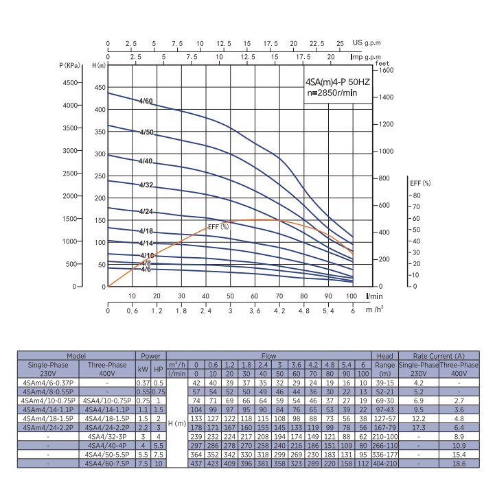 Ponorná vícestupňová odstředivá čerpadla řady 4SAm jsou sestavena z hydraulické části a jednofázového elektromotoru.
