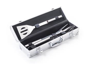 Sada obsahuje kompletní nástroje pro grilování bez potíží. Součástí sady je obracečka, vidlička a kleště o délce 34 cm. Pro snadné přenášení a skladování je nářadí uloženo do praktického hliníkového kufru.