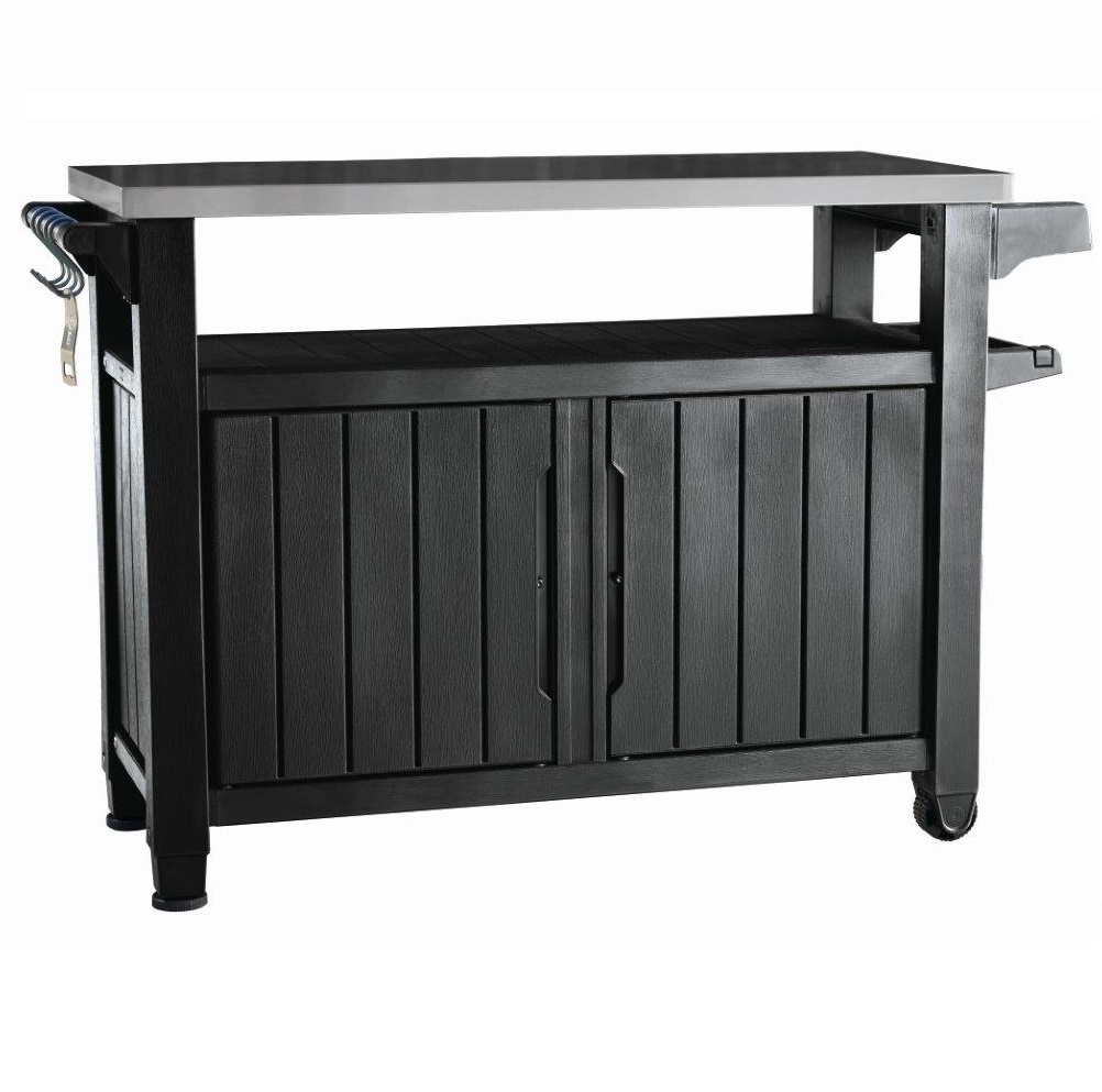 Grafitový grilovací stolek Unity značky Keter má kapacitu 207 litrů. Nerezová pracovní deska, praktická rukojeť s háčky na pověšení utěrek a kolečka pro přemisťování stolku dohromady vytvářejí dokonalé prostředí pro venkovní grilování.