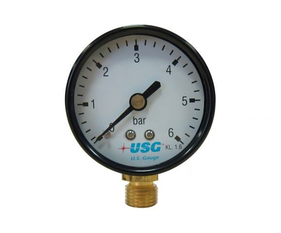 Manometr o měřícím rozsahu 0 - 6 bar se spodním mosazným připojením G 1/4".
