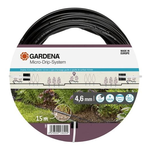 Nadzemní kapací hadice od společnosti Gardena ze systému Micro-Drip slouží k zavlažování řádků rostlin a menších ploch s rostlinami na květinových nebo zeleninových zahradách. Rozestupy kapačů v hadici jsou 30 cm a každý z kapačů dávkuje jemně vodu rychlostí 1,5 l za hodinu. Díky inovativní labyrintové technologii jsou kapače samočisticí. Díky malému průměru 4,6 mm (3/16") je kapací hadice obzvláště ohebná a snadno se instaluje.