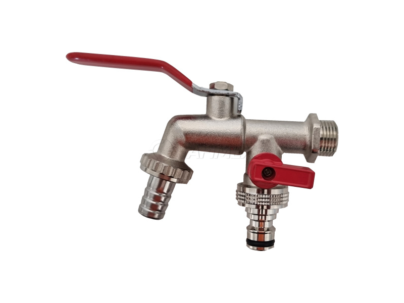Dvojitý zahradní kulový kohout. Umožňuje napouštět vodu a současně mít připojenou hadici např. k postřikovači.