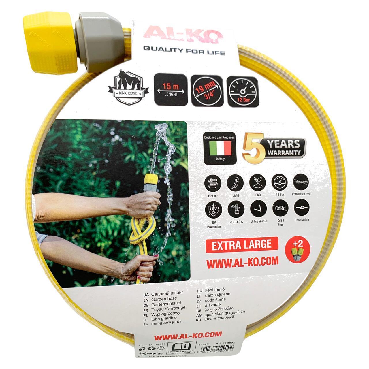 Armadillo Kink Kong je superlehká, inovativní a nemačkavá zahradní hadice, kompletně vyrobena v Itálii. Nahrazuje nepohodlné tradiční zahradní hadice, oproti kterým váží až 3x méně. Zvláštní struktura této hadice (3/4 ″) Armadillo Kink Kong je odolná proti zmačkání a zkroucení. Hadice je již vybaven dvěma pogumovanými koncovkami Idroeasy, které jsou kompatibilní s veškerým příslušenstvím na trhu vybaveným rychloupínacím systémem na zahradu. Materiál je zcela netoxický, vyrobený ze surovin, které neuvolňují znečišťující látky do protékající vody.Výhody