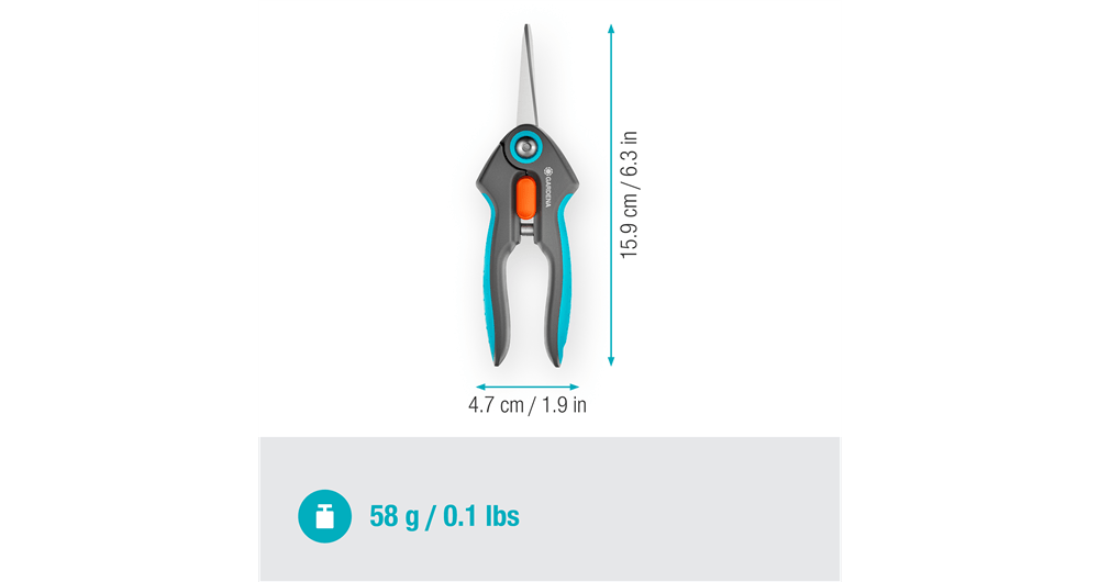 Nůžky FreshCut značky GARDENA jsou obzvláště vhodné pro sklizeň čerstvých bylinek, lesních plodů nebo řezaných květin. Úzké, špičaté přesné nože vyrobené z odolné nerezové oceli na vás zapůsobí při každém střihu. S pomocí nůžek FreshCut se vám podaří provádět čisté a přesné střihy až ke špičce. Nůžky na sklizeň zvládají i těsná místa, takže můžete snadno sklízet bazalku nebo květy hluchavkovitých rostlin. Nůžky se pohodlně a bezpečně drží v ruce díky protiskluzovým rukojetím ErgoTec s měkkými prvky. Pro bezpečné skladování a přepravu nasaďte na uzavřené nože přiložený bezpečnostní kryt. Jednoruční uzamykací mechanismus vám umožní nůžky jednoduše odemknout a pevně je uzamknout. Bez ohledu na to, co stříháte, nože vhodné pro styk s potravinami nevydávají chuť ani vůni. Pro snadné čištění jsou nůžky vhodné do myčky nádobí. Opatrná manipulace. GARDENA mikrostřih.