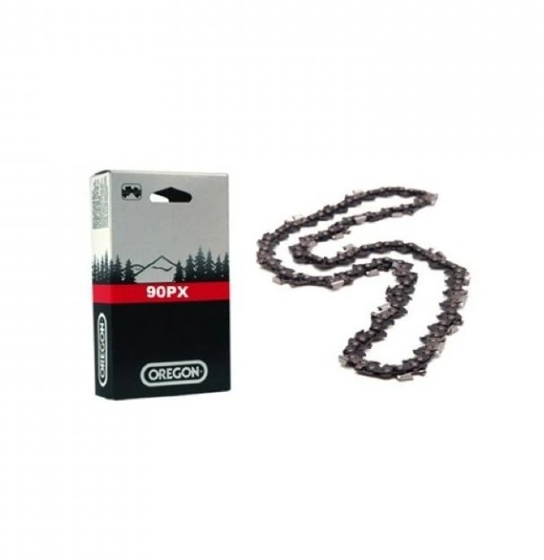 Pilový řetěz Oregon 90PX se vyznačuje úzkou řeznou spárou a vysokým výkonem. Je šetrný k pohonné jednotce, má nízký zpětný vrh a zaručuje nízkou spotřebu paliva. Není náročný na údržbu.