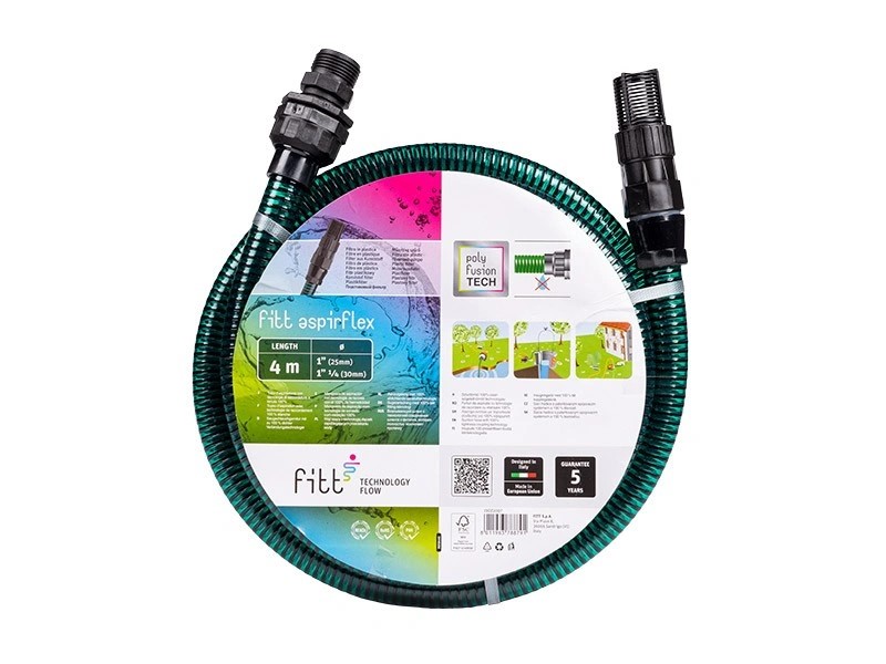 Fitt ASPIRFLEX je průmyslová hadice z PVC vyztužená spirálou proti podtlaku (během sání se nezužuje), opatřená na jedné straně sacím košem se sítkem hrubých nečistot a zpětným ventilem a na straně druhé plastovými spojkami. Hadice je určená pro připojení sání povrchových čerpadel, zejména pro odvodňování a zavlažování. Umožňuje snadné čerpání vody z jezírek, potoků, studní a cisteren. Hadici lze bez problému použít v rozmezí teplot -10°C až +60°C (s ohledem na zamrznutí). Technologie POLYFUSION TECH zajišťuje těsnost spojení mezi hadicí a spojkami, čímž zabraňuje únikům vody a zajišťuje správnou funkci čerpadla.