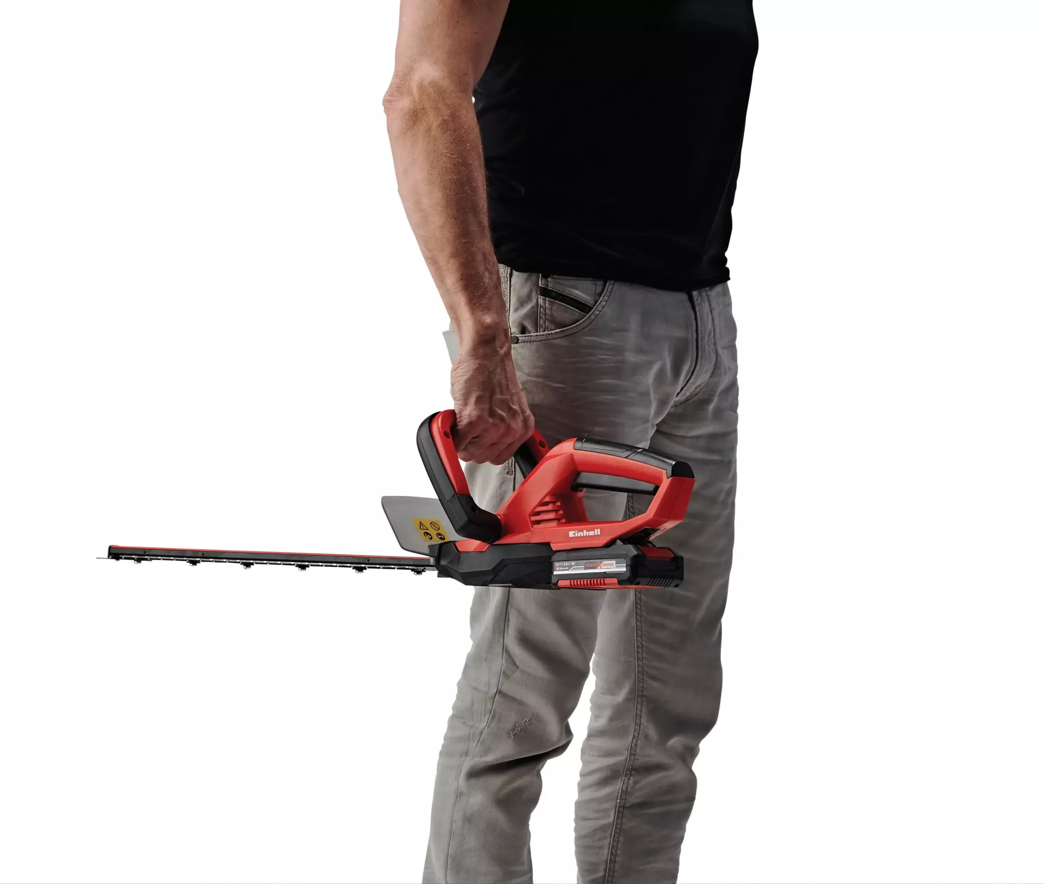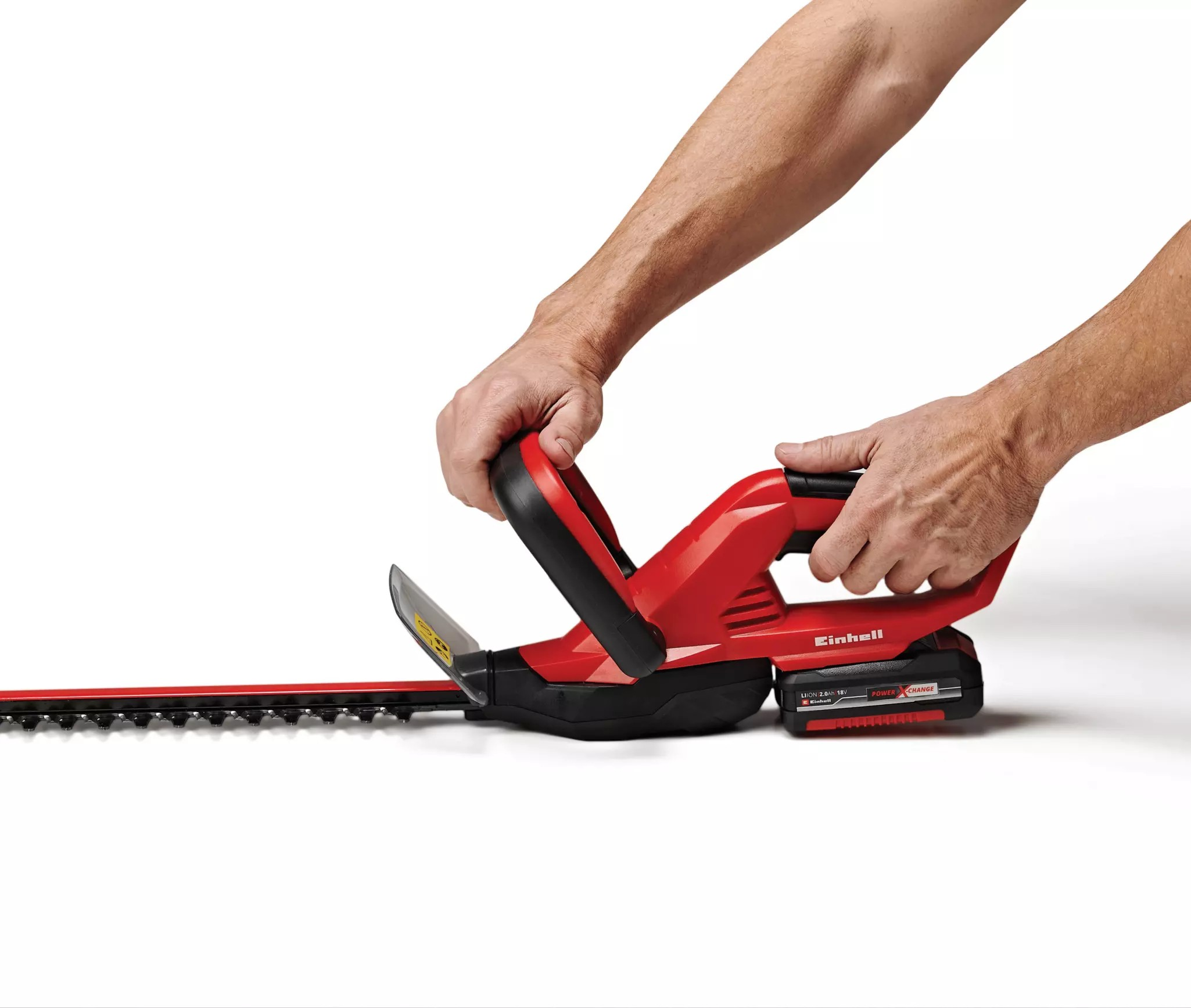 Aku nůžky na živý plot GC-CH 1846 Li Kit jsou vysoce výkonný přístroj, který díky své nízké hmotnosti a praktické velikosti umožňuje mimořádně pohodlnou, na elektrické síti nezávislou, údržbu živých plotů, keřů a křovin na velkých pozemcích a v zahrádkářských koloniích. Díky novému systému baterií Power X-Change od firmy Einhell disponují nůžky na živý plot 18V baterií s 2,0 Ah pro dlouhou dobu provozu. Nůžky GC-CH 1846 Li Kit mají indikátor stavu baterie se třemi LED diodami, na kterém se uživateli přehledně zobrazuje aktuální stav nabití. Baterie lze kromě toho použít pro všechny přístroje rodiny Power X-Change. Součástí dodávky je přídavná rychlonabíječka. Při uvolnění jednoho ze spínačů integrovaný obouruční bezpečnostní spínač zastaví čepele za méně než 1 sekundu. Nože jsou chráněny hliníkovým krytem čepele. Ochrana proti nárazům je opatřena otvorem pro montáž na stěnu, díky čemuž jsou nůžky na živý plot během okamžiku uloženy tak, aby nezabíraly příliš místa. Kovová převodovka zajišťuje dlouhou životnost a nože vyrobené z laserem řezané a diamantem broušené oceli zajišťují čisté výsledky stříhání. Nůžky GC-CH 1846 Li Kit lze bezpečně a pohodlně přepravovat nebo skladovat v odolném pouzdře.