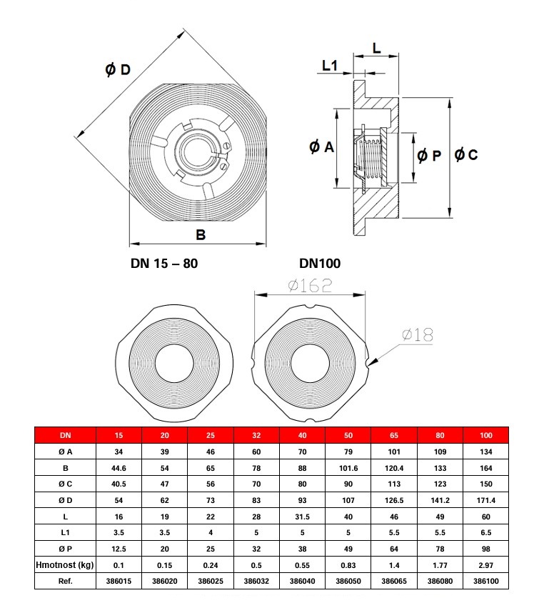 Celonerezová zpětná klapka s pružinou.