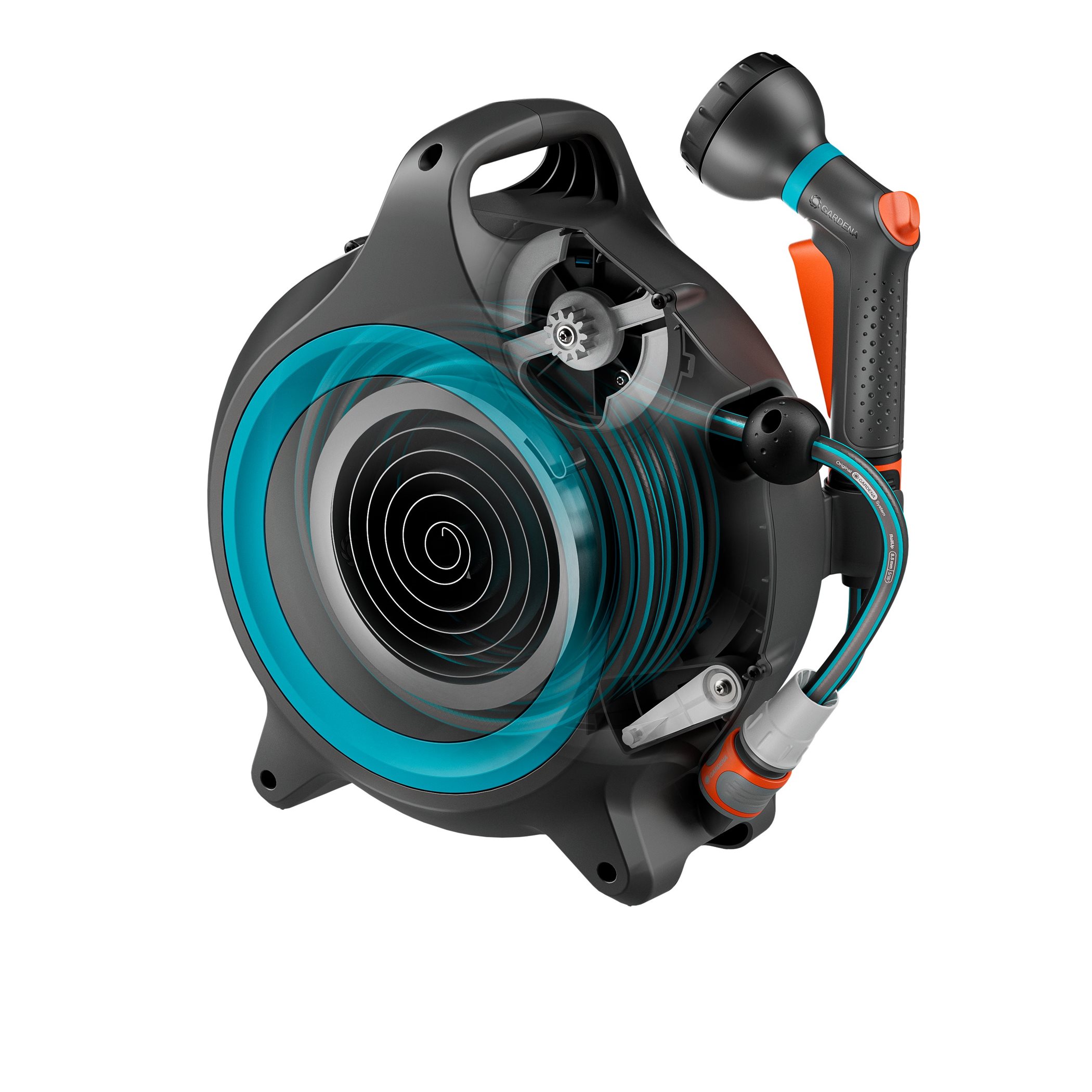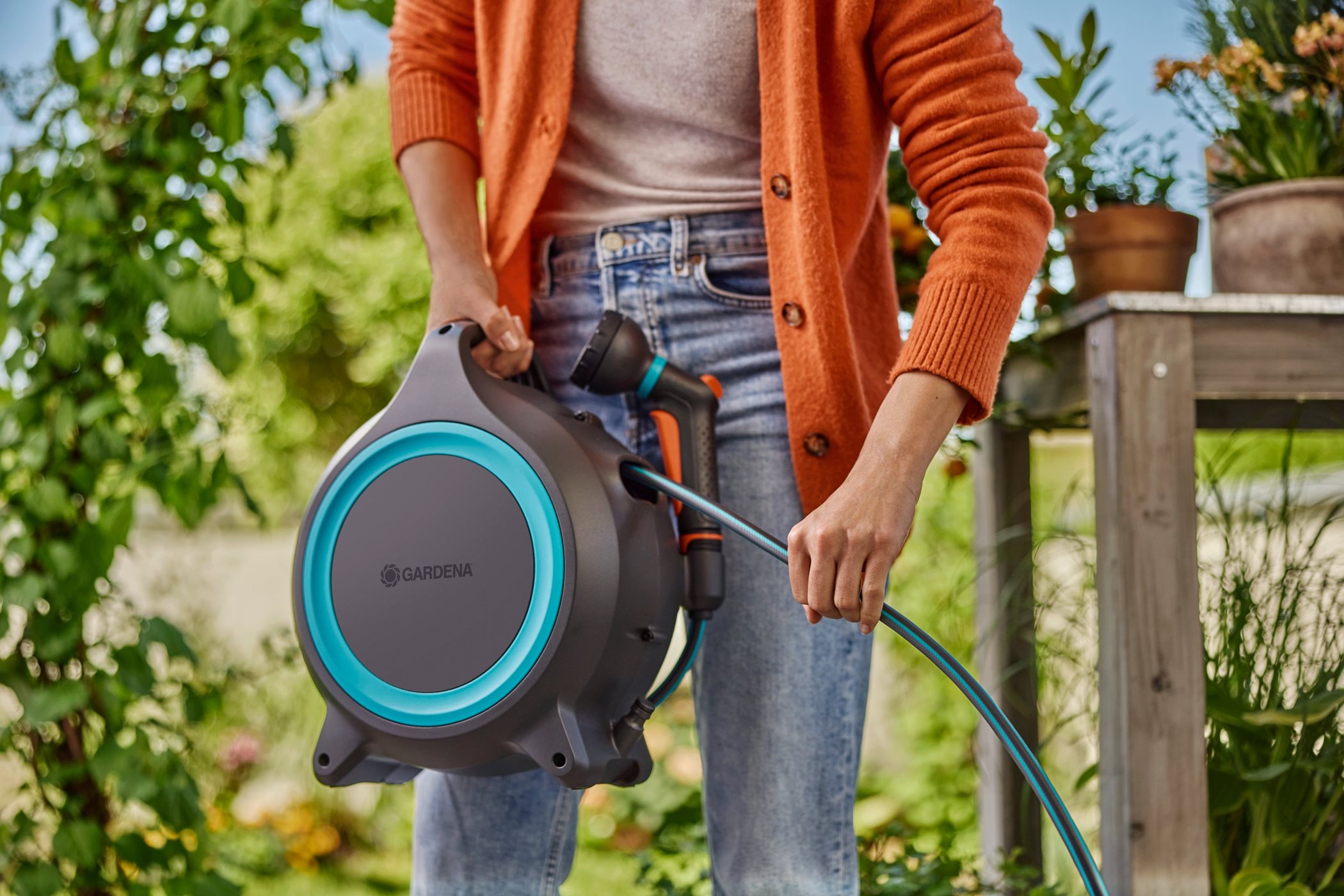 Přenosný box na hadici MoveMatic od společnosti Gardena je malý, kompaktní a praktický. Díky automatickému navíjení hadice, 12,5 m hadici a 1,5 m připojovací hadici je vhodný pro balkony, terasy a na cesty.