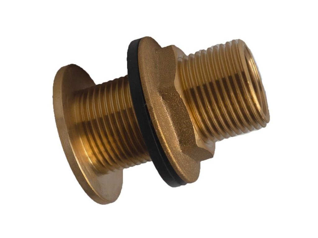 Mosazná průchodka k nádrži s pryžovým těsněním na utěsnění průchodu (pryžové těsnění je součástí balení). Průchodka slouží k vytvoření průchodu ve stěně nádrže s možným napojením na klasický trubkový závit a propojit tak např. dvě nádrže, přidat k nádrži ventil na vypouštění/dopouštění, vytvořit přechod na sání čerpadla a podobně.