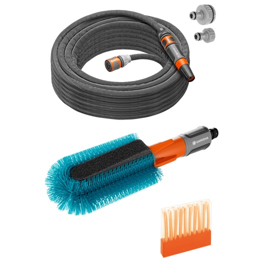 Sada obsahuje: 1 x kartáč na kola, 1 x hadice Liano™ Life s armaturami, 1 x mýdlové tyčinky, 2 x šroubení, 1 x adaptér, 1 x čisticí postřikovač.
