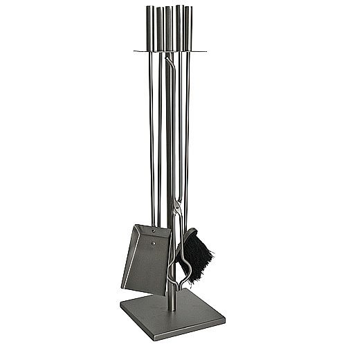Pětidílná sada krbového nářadí z pevného kovu v černé barvě. Krbové nářadí se stojánkem je praktický dekorativní doplněk ke krbovým kamnům.