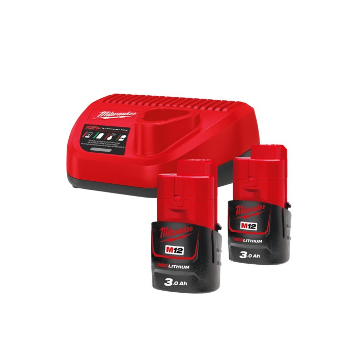 M12™ sada dvou akumulátorů o kapacitě 3,0 Ah a nabíječky Milwaukee.