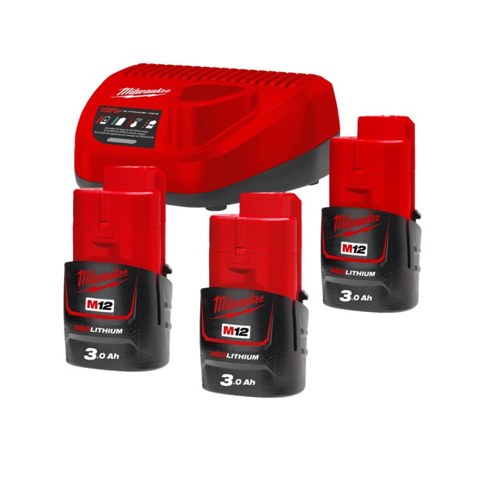 M12™ sada tří akumulátorů o kapacitě 3,0 Ah a nabíječky Milwaukee.
