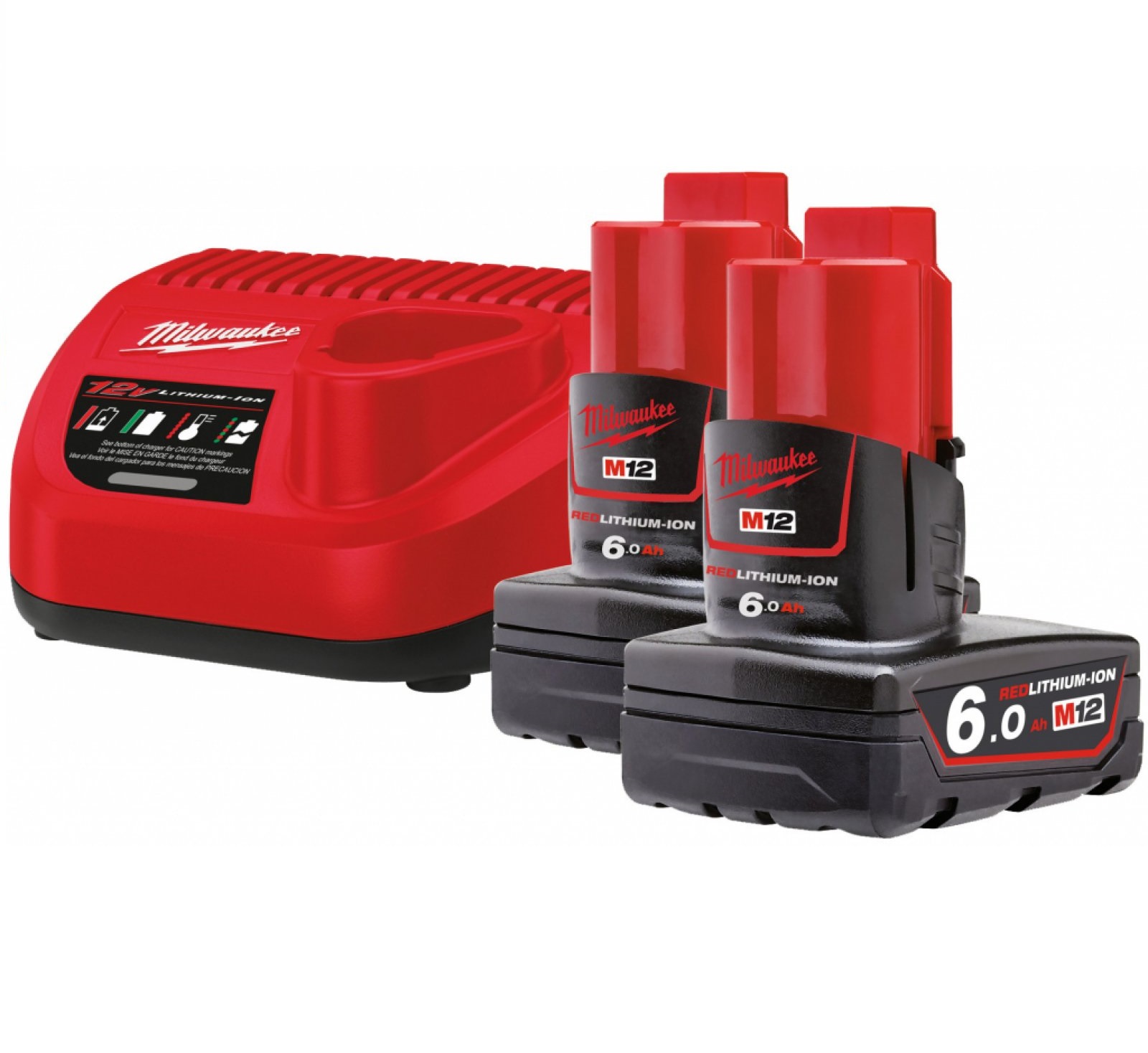 M12™ sada dvou akumulátorů o kapacitě 6,0 Ah a nabíječky Milwaukee.