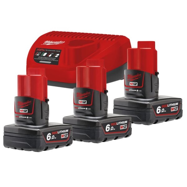 M12™ sada tří akumulátorů o kapacitě 6,0 Ah a nabíječky Milwaukee.