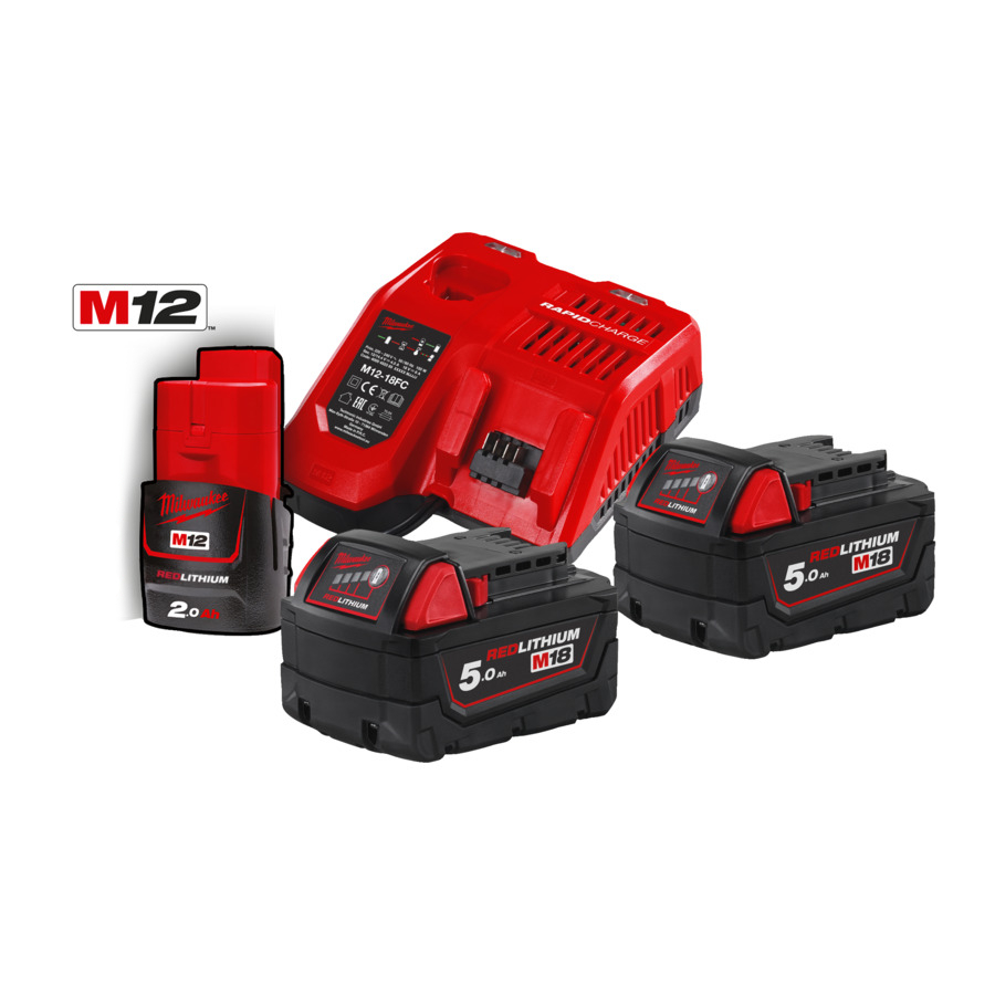 Sada obsahuje: 2x akumulátor M18 B5, 1x akumulátor M12 B2 a 1x rychlonabíječka M12-18 FC.