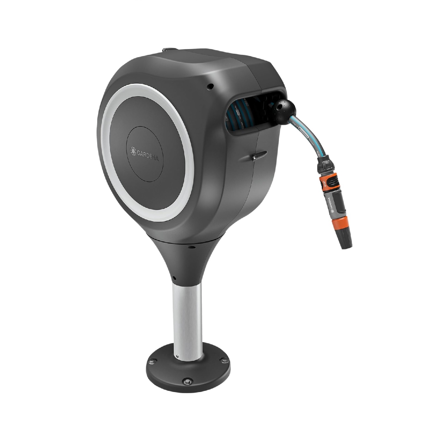 - Technologie Intelligent RollUp: Při odvíjení se hadice díky praktickým krátkým aretačním zarážkám uzamkne v požadované délce. Po zavlažování se lehkým zatažením za konec hadice uvolní zámek, čímž se aktivuje integrovaná ocelová pružina, která hadici automaticky navíjí.
