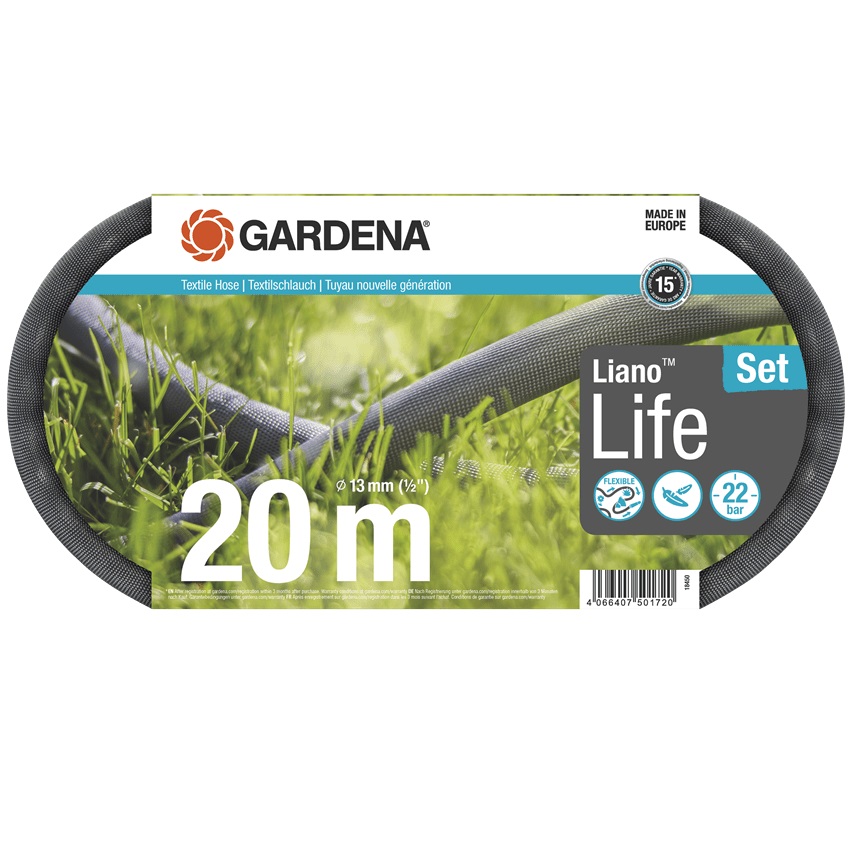Textilní hadice Liano™ Life 20 m prodávaná jako sada značky Gardena je připravena k okamžitému použití. Zahradní hadice získává svůj spolehlivý výkon díky flexibilní vnitřní hadici z PVC a inovativní vnější hadici vyrobené z odolné textilní tkaniny. Při zavlažování nebo čištění je elasticita skvělou podporou, protože Liano™ Life se neláme a je méně pravděpodobné, že se zasekne na překážkách. Hadice Liano™ Life je až o 50 % lehčí než běžné PVC hadice .