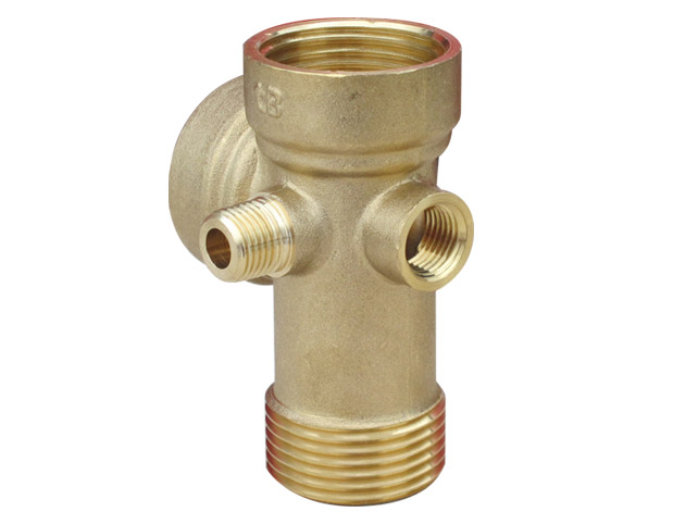 Pěticestná mosazná tvarovka určená k připojení manometru a tlakového spínače do domácího rozvodu vody.