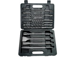 vrtáky: 250mm: plochý 20 a 40mm, špičatý, drážkovací, 6-8-10x160mm, 8-10-12x210mm, 10-12-14x260mm. V plastovém kufru.
