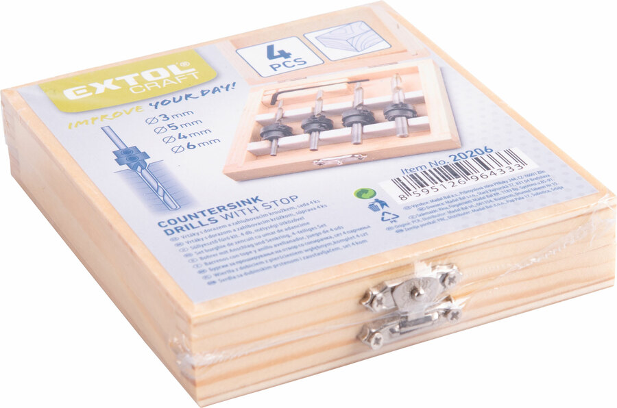 Vrtáky do dřeva s dorazem, sada 4ks, do dřeva, se zahlubovačem, v dřevěné kazetě.Doplňující technické informace