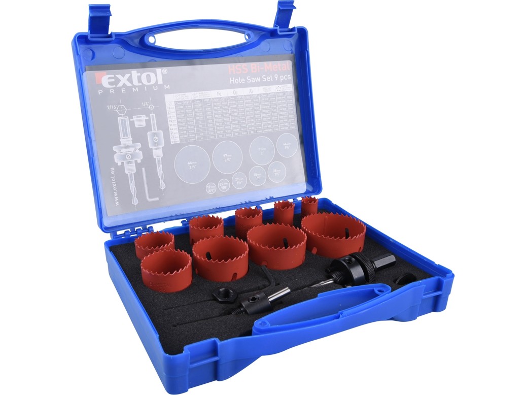 Vrtáky korunkové, univerzální, 9 průměrů, ?19-64mm, HSS/Bi-metal.