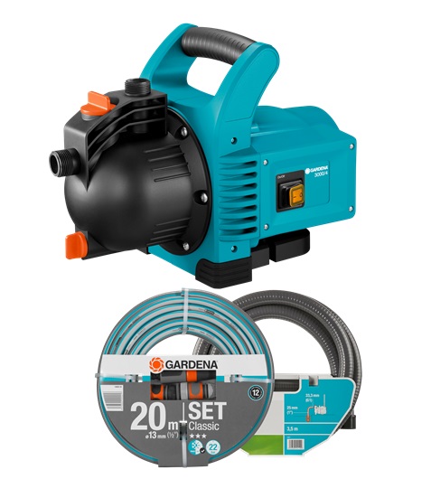 Součástí balení: zahradní čerpadlo 3000/4 řady Classic, 3,5m sací hadice včetně sacího filtru a zpětné klapky, 20m zahradní hadice (13 mm Ø - 1/2") a připojovacího šroubení Original Gardena systému včetně trysky.