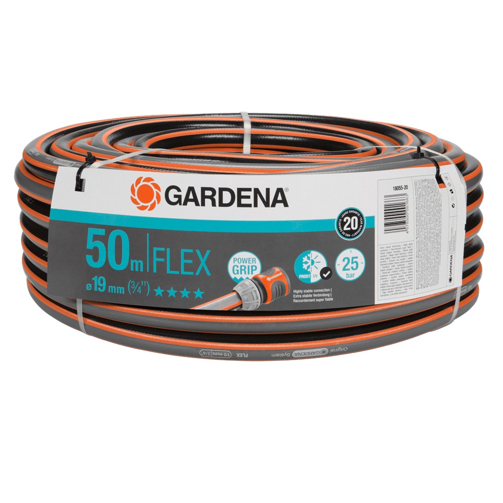 Zahradní hadice 3/4" (19mm) 50m FLEX Comfort Gardena s profilem Power Grip zaručuje perfektní spojení mezi hadicí a spojkou. Díky nové technologii funguje toto blokování jako ozubená kola. Profil Power Grip umožňuje to, co si mnozí majitelé zahrad již dlouho přáli: spolehlivé spojení s dokonalou přídržnou sílou. Pozitivní vedlejší efekt nového profilu: hadice se lépe navíjí a dobře kloužou. Díky textilii se spirálovými oky s dvěma spirálami v opačných směrech, je hadice odolná vůči tlaku a udržuje svůj tvar, ale je pružná a snadno se s ní manipuluje.