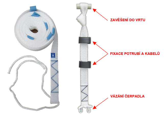 Závěsné zařízení umožňuje pohodlné zavěšení čerpadla do vrtu, studny, jímky a podobně. Garantovaná nosnost s dodanými komponenty je max. 200 Kg. Výrobek je stálý v ropných produktech, v ředěných kyselinách, v oleji a etanolu. Veškeré komponenty z nichž se závěsné zařízení skládá je ze zdravotně nezávadných materiálů a vyhovuje styku s pitnou vodou.