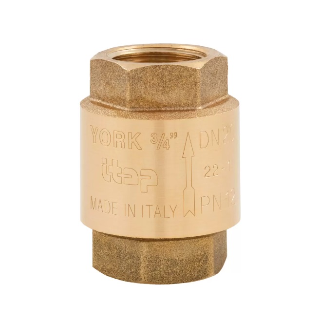 Zpětná klapka YORK má uvnitř mosazného tělesa plastovou zpětnou klapkou osazenou pryžovým těsněním a na sedlo jí přitlačuje nerezová pružina. Zpětnou klapku můžeme instalovat jak ve svislé, tak i ve vodorovné poloze a hodí se především do méně náročných provozů (hobby použití). Osazením zpětné klapky sítkem vznikne sací koš.